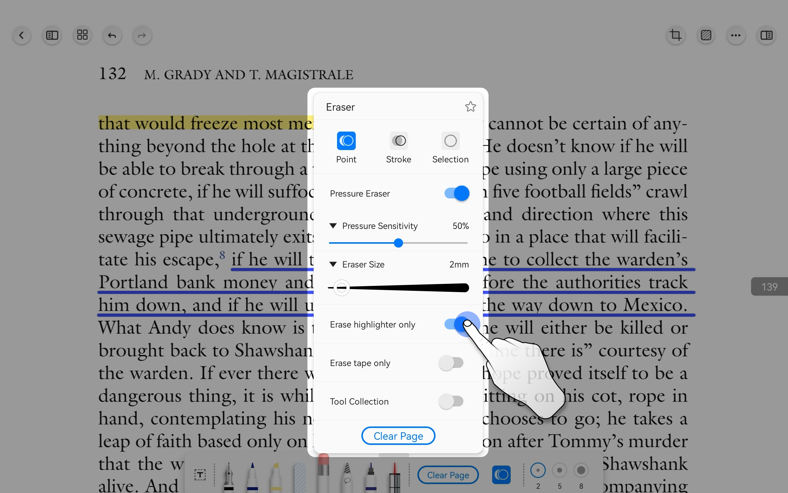 In the eraser options menu, there is a new "Erase Highlighter Marks Only" switch. When you enable this switch, your eraser will only remove the highlighter marks. You can use any of the three erasing methods: pixel erasing, whole-stroke erasing, or lasso erasing, and it will specifically target the highlighter marks for removal.
